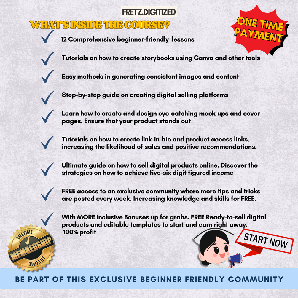Learn how to build your brand and create your first digital product with our beginner-friendly mini course! Use Canva and ChatGPT to design beautiful, resellable eBooks and list them easily on online selling platforms. This course includes 12 step-by-step video tutorials on creating children's storybooks, eBook templates, mockups, thank-you pages, and more. You’ll also get digital marketing tips to boost your sales.